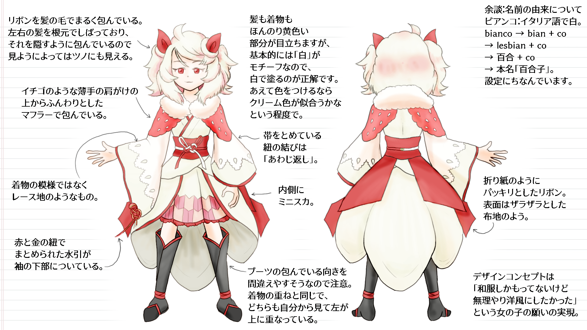 設定画に書いてある通りです。 しろのわかさんのナイズにて生まれた子。 しろのわかさん宅は99%がBLとGLなので百合をテーマに色々と盛り込んだ子になりました。