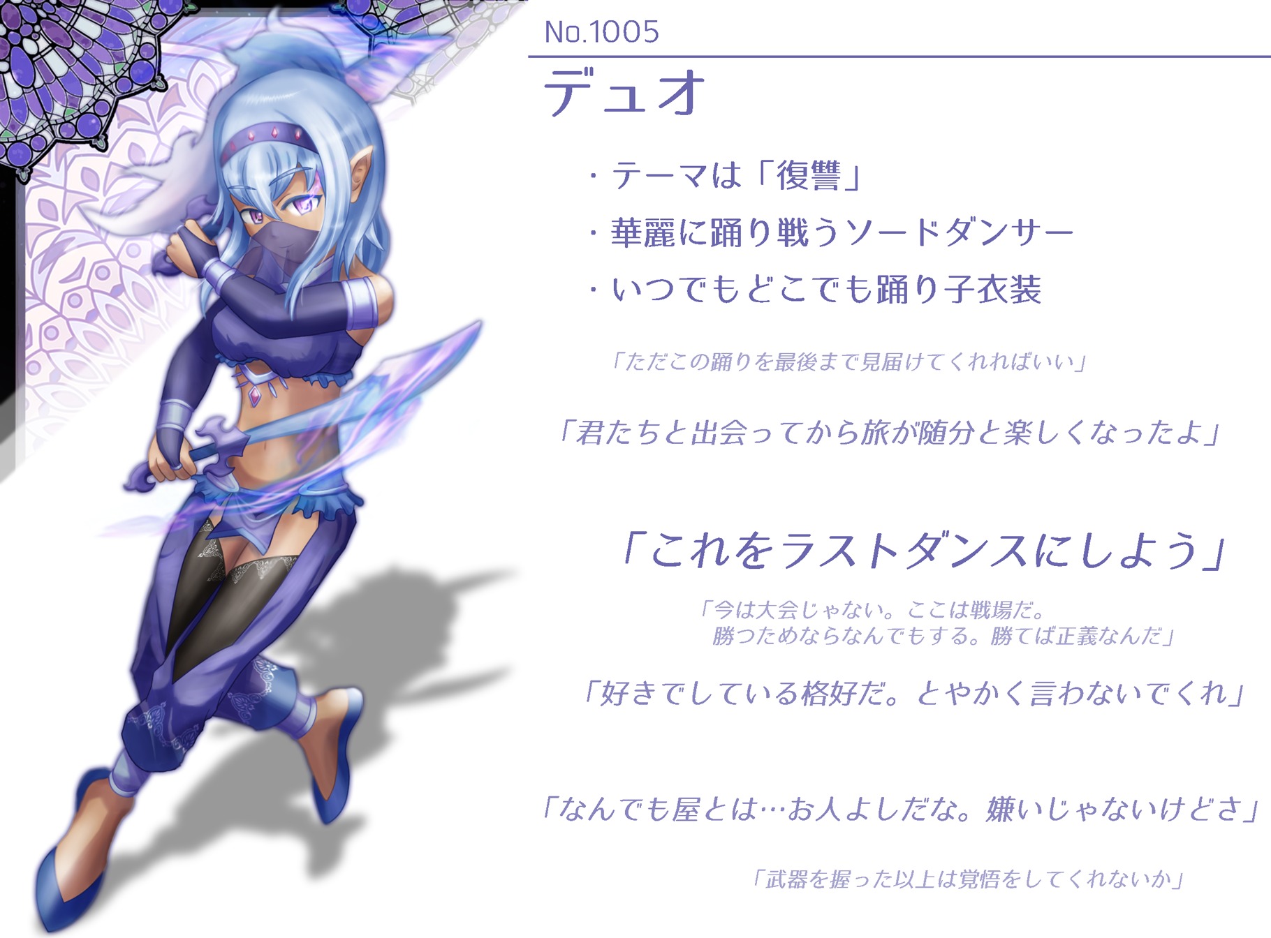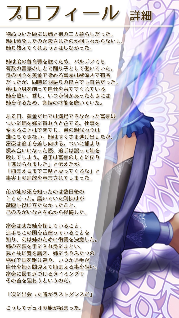 剣技も舞踊も一級品で、様々な地方の武闘大会に出没し、まるで踊るようなモーションから次々と放たれる斬撃に敵は倒れ、観客は魅了される。声色や口調が中性的なせいか、女性ファンも多い。