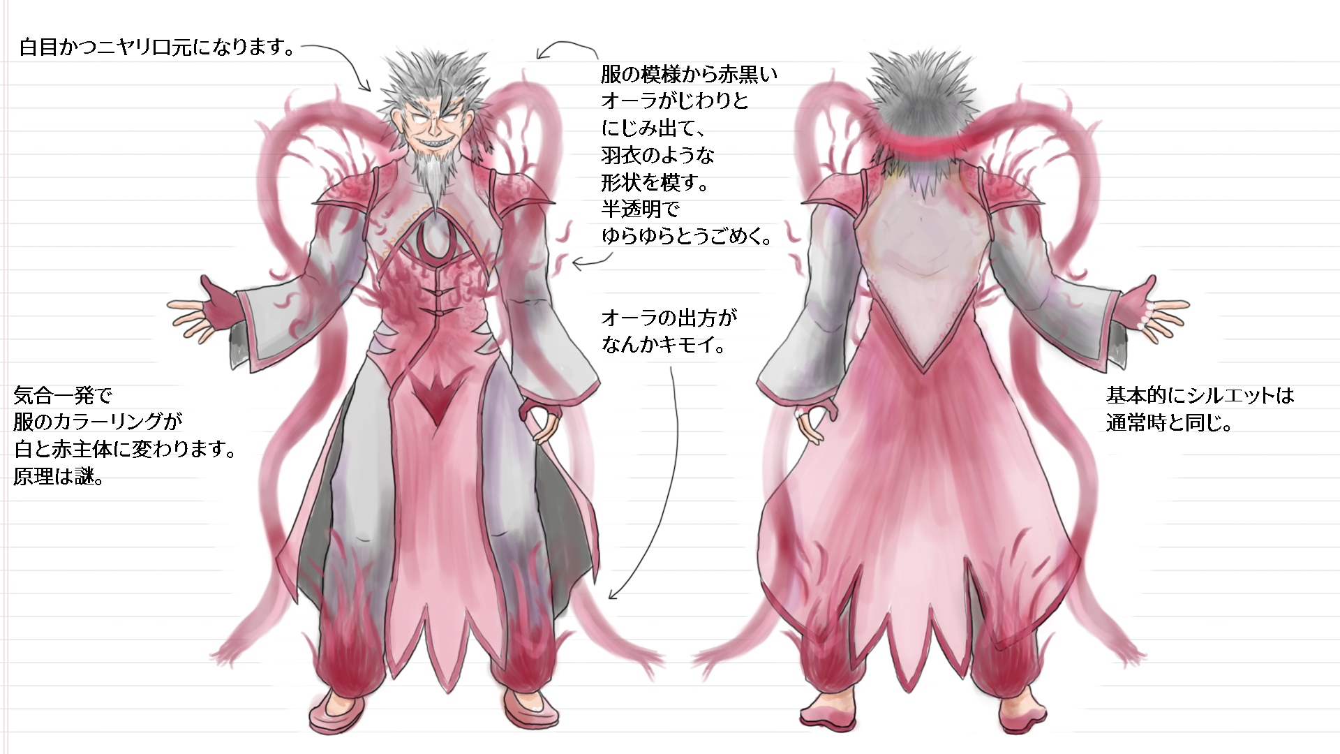 白目を剥き、なぜか衣装の色が変化し、身体中からほとばしるオーラは羽衣のような形状を成す。