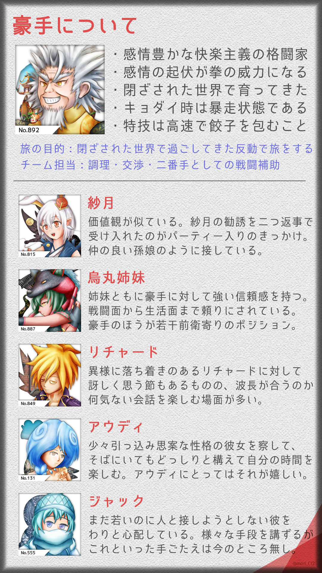 姉妹共に豪手に対して強い信頼感を持つ。戦闘面から生活面まで頼りにされている。豪手のほうが若干前衛寄りのポジション。