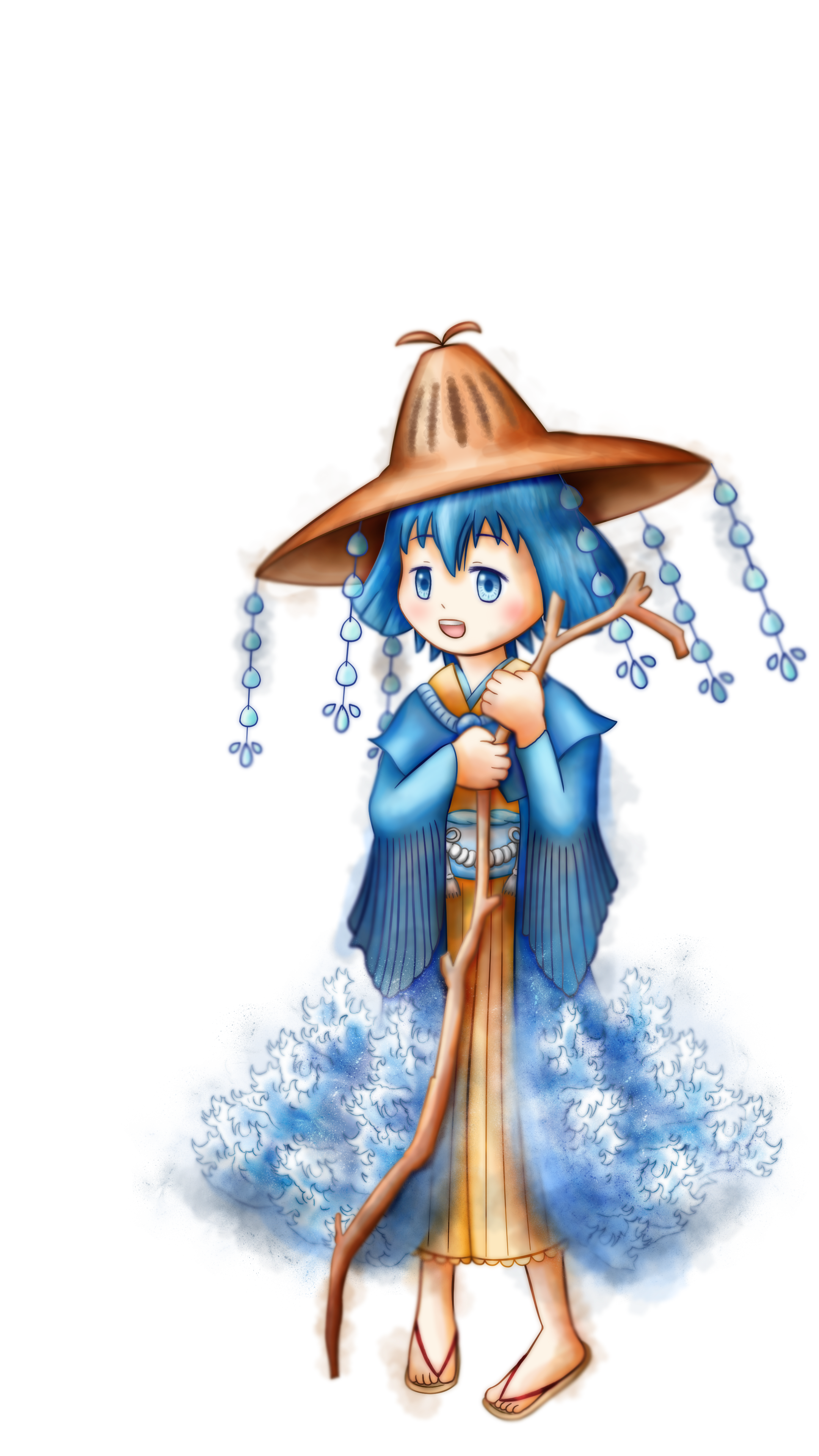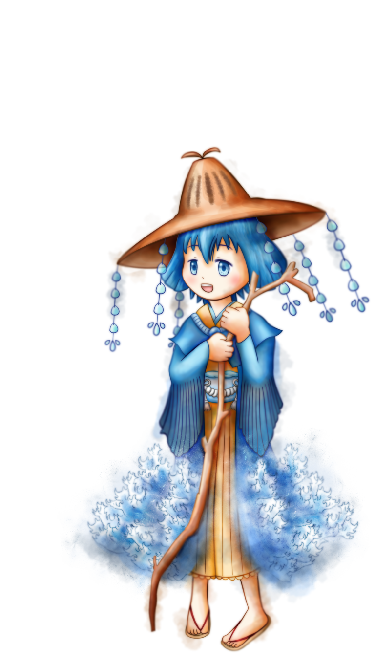 彼女が杖をかかげると、遠い海に大きなクジラが姿を現し、その巨体をうねらせて水面をばしゃあばしゃあとかき乱す。幾多もの高波は水しぶきを生み出し、細かな水の粒となって空へと立ち昇り、次第に大きな雲を形づくっていく。どっしりと構えられた雨雲は、やがて彼女の元へやって来て、長きに渡りしとしとと降る雨となり、人々に恵みをもたらす。