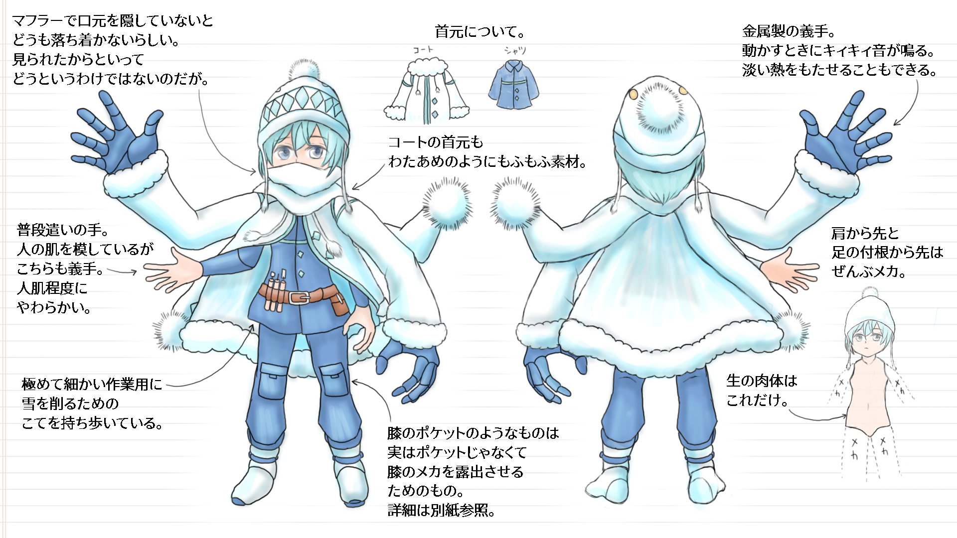 もともとは寒さに負けず外で楽しくおおらかに遊ぶ少年だったそうだが、ここまで殺伐と消極的な性格になってしまったのは、過去の出来事が関係している。どうやら義手義足になってしまった経緯もそこにあるようだ。
