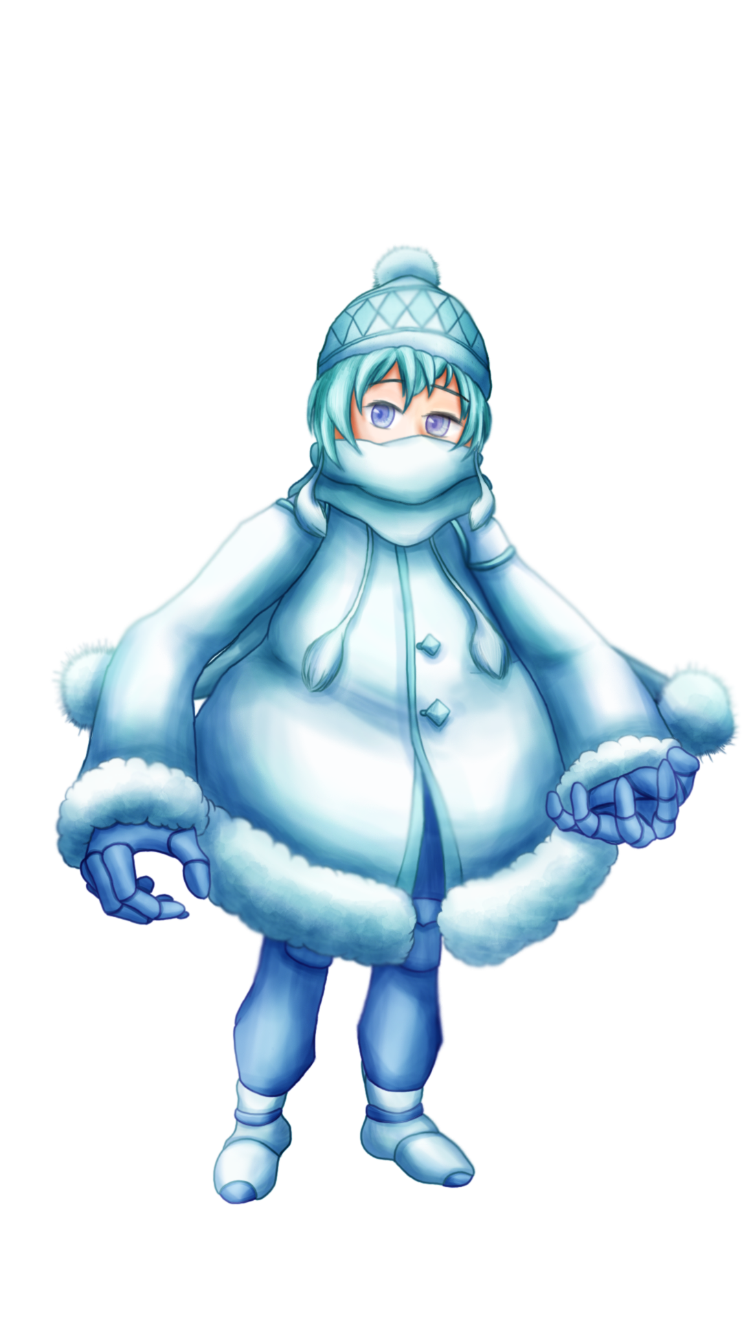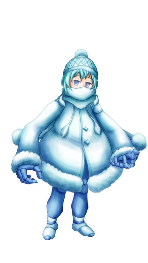 ニット帽の中から雪をつくりだし、それをいじくりまわして一人で遊んでいる。あまり他人と関わろうとはしない、消極的な性格。