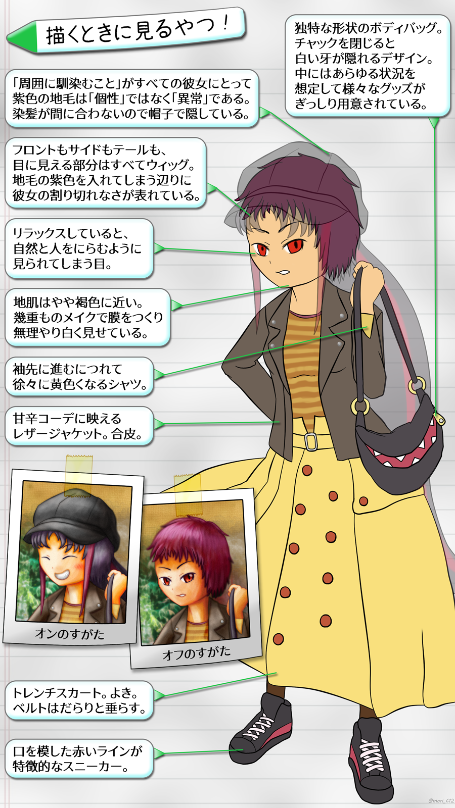 2019/04 エイプリルフールにちなんで「嘘」をテーマに練った子です。さりげなく色違いで、色違いであることさえも隠しているので、帽子やかつらや肌色のチェンジで二度楽しめるデザインとなっております。甘辛なファッションも含めて個人的にだいぶお気に入りです。