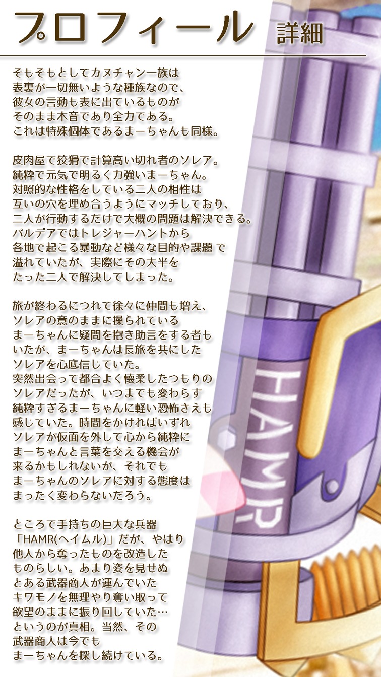 レイドで突然出てきた即戦力の女の子。 マスカーニャとデカヌチャンのタイプ相性補完が あまりにも良すぎて、ストーリーの大半は ソレアとまーちゃんの二人でクリアしてしまいました。 設定にもそのあたりが盛り込まれています。