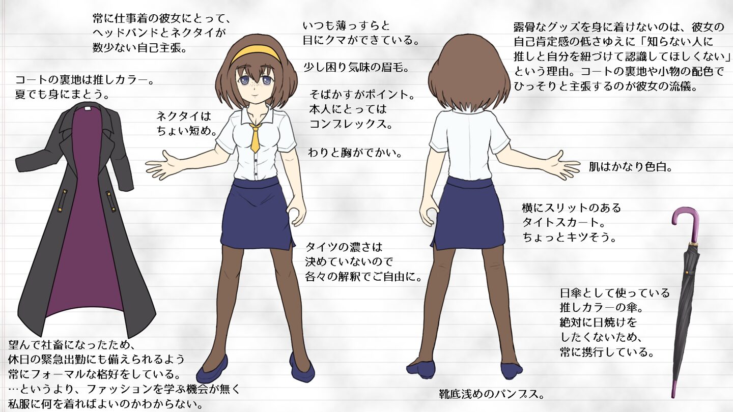 そばかすが目立つ、肌荒れと疲れ目に悩むキャリアウーマン。独身。おどおどと引っ込み思案で何かに怯えているように見えるかと思いきや、パニックに陥り落ち着きの無い一面を見せることも多い、不安定な性格。