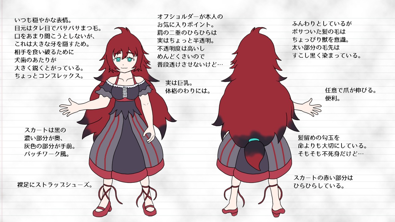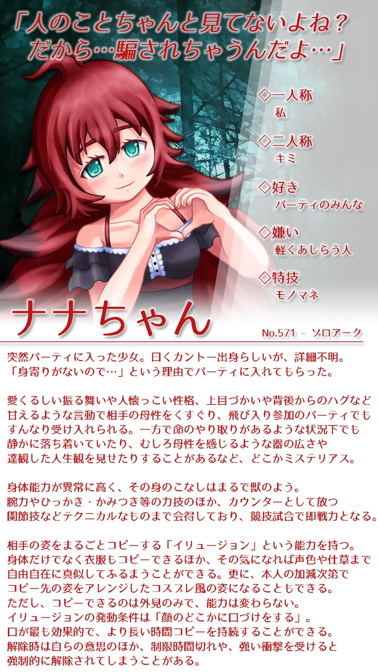 素ナナちゃんのイリュージョンの設定は、戦闘時は完全に 他人の姿になりすましてふいうちを狙いますが、 普段は他人の姿…特に服装をほどよく取り入れてコスプレっぽく 楽しんでいたりします。イリュージョンの発動条件がキスで、 その位置が口に近いほど長く正確に変身できるのがポイント。