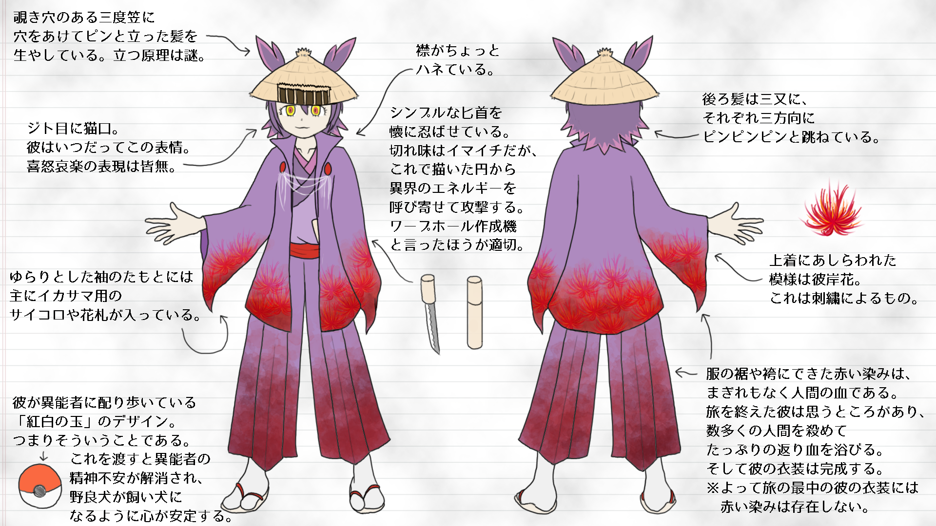 なお、錦が所有している能力は、匕首(アイクチ:懐の鍔の無い短刀)で描いた円から超自然現象を呼び起こす能力。円はワープホールのように穴が開き、そこからは異界の風や引き込むような闇、心を掻きむしるような悪意、血も凍る冷気などが溢れだすという。