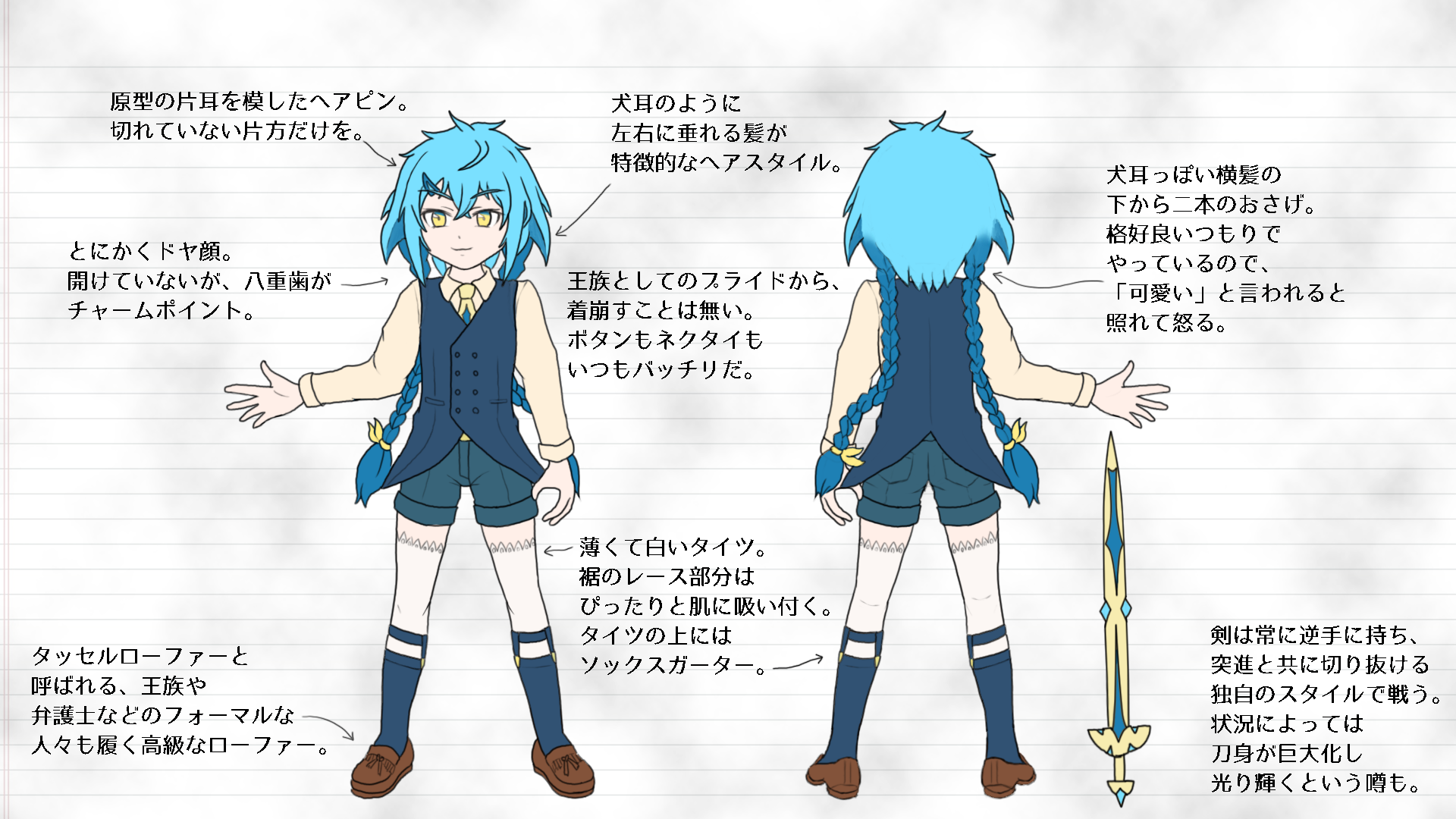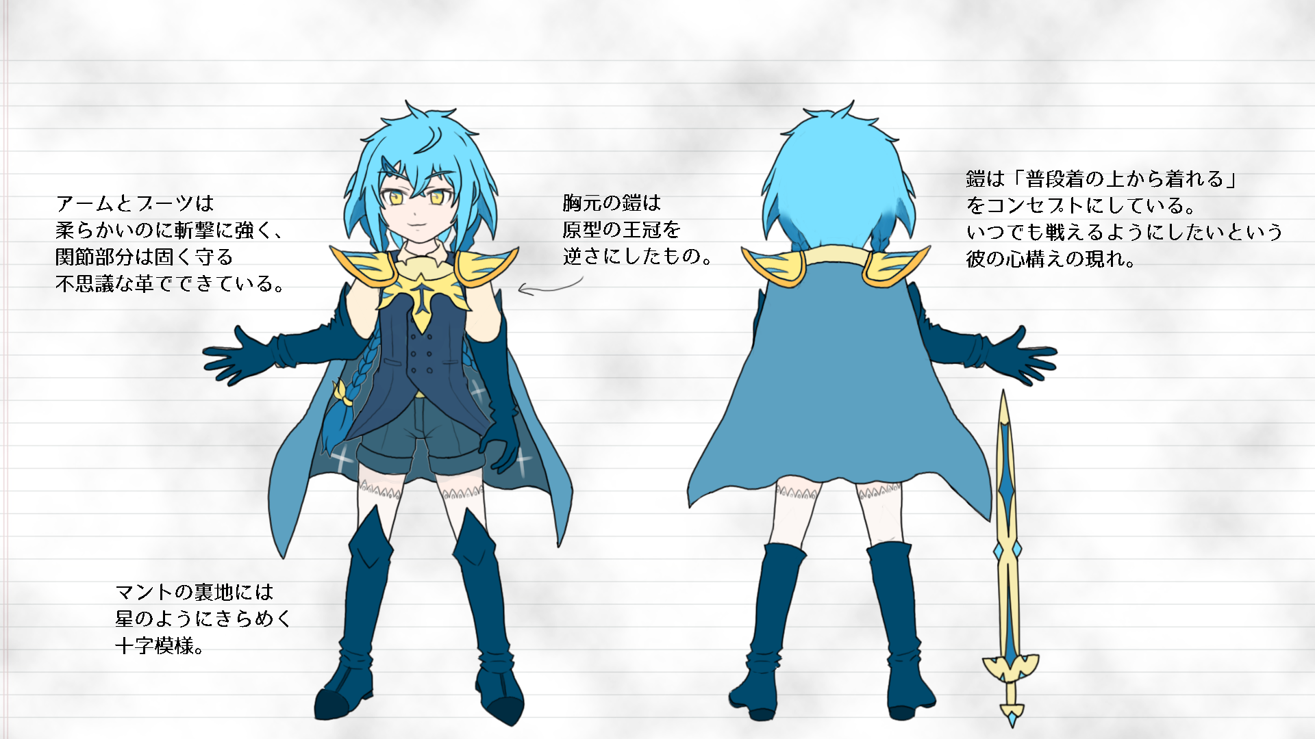 いつ生まれたのか、どこで育ったのか、彼には記憶が無い。 わずかな手がかりとしては、彼自身が「ボクは王子だ」という とても強い自覚やプライドを持っていることと、 気づいたときには身に着けていた王族らしい衣装と剣くらいである。