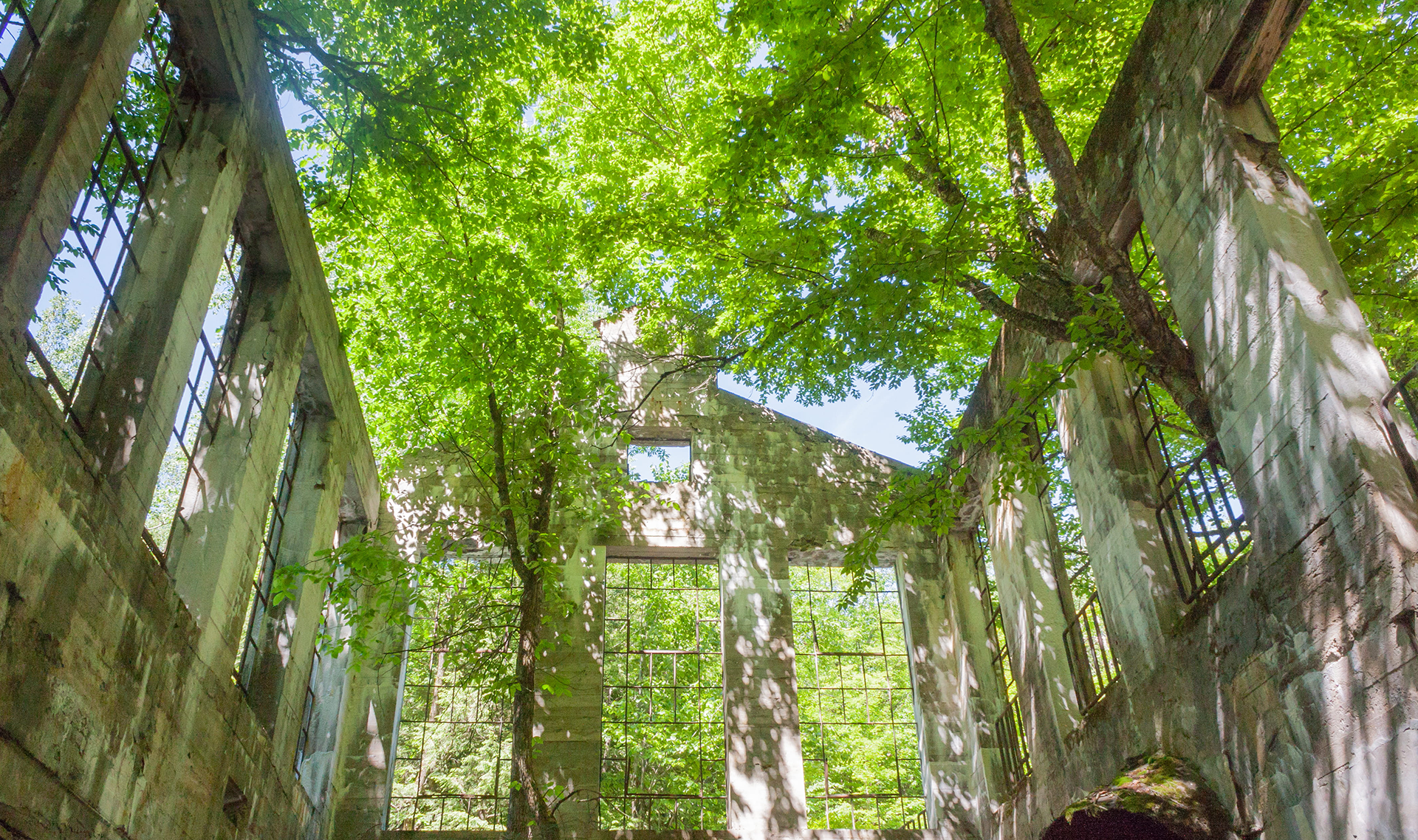 Blu Cityのメインストリート裏側、人気の少ない廃墟の中。天井の代わりに青空が広がり頼りない瓦礫にびっしりと木々が絡みつく。日照時間の短い街の中でもここには充分な光が差し込む。