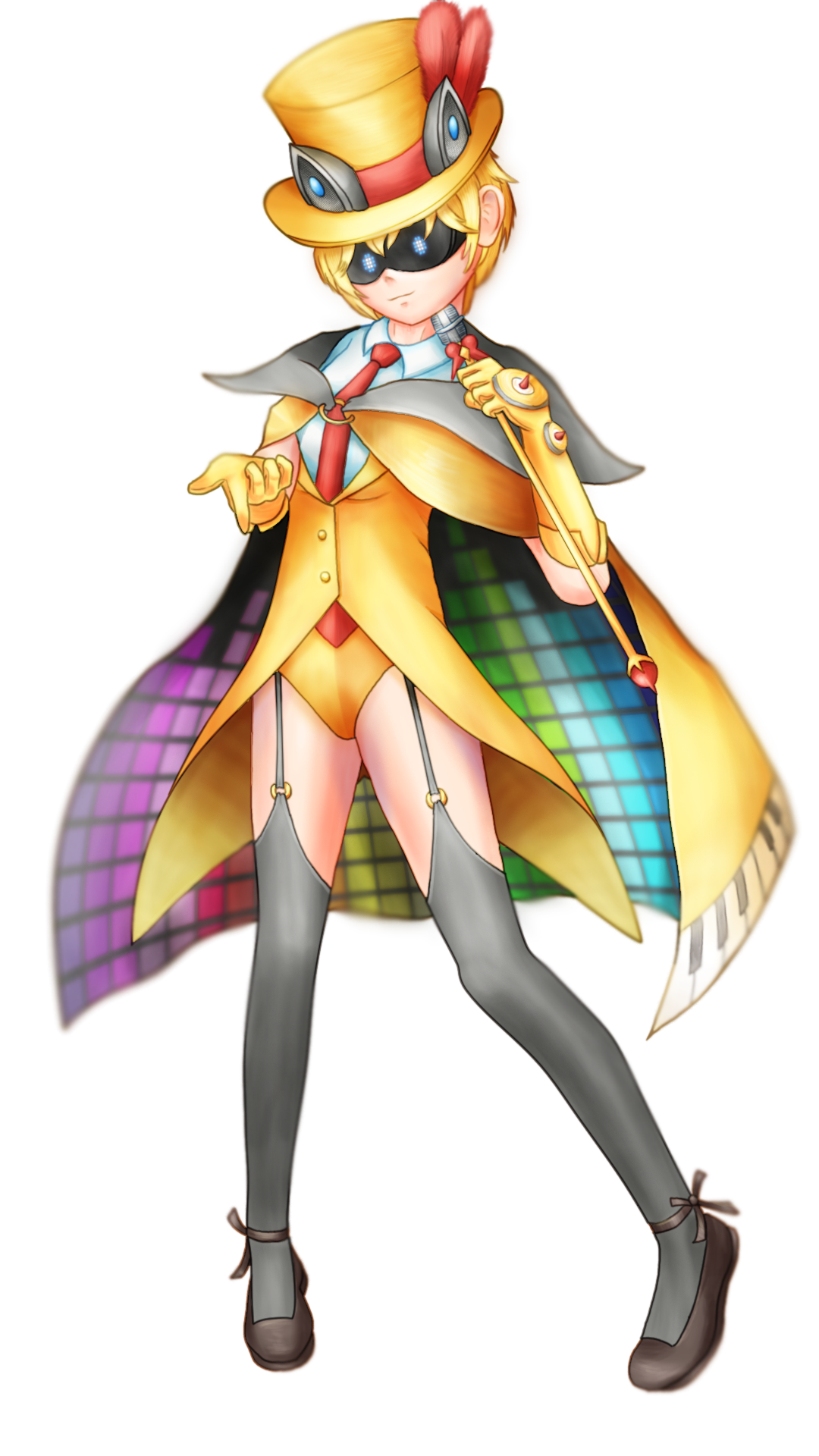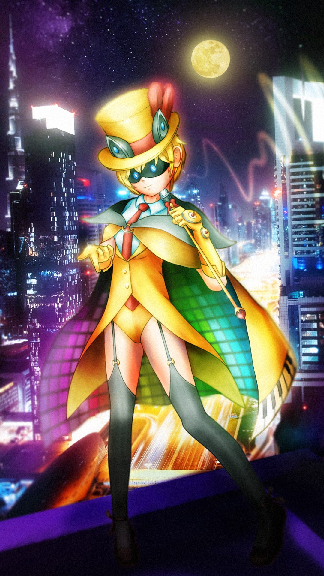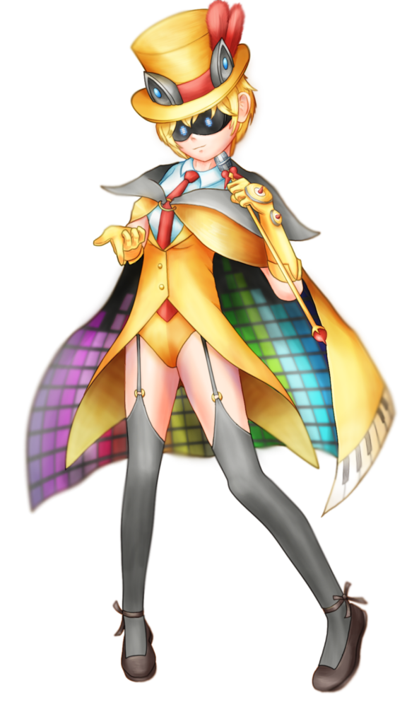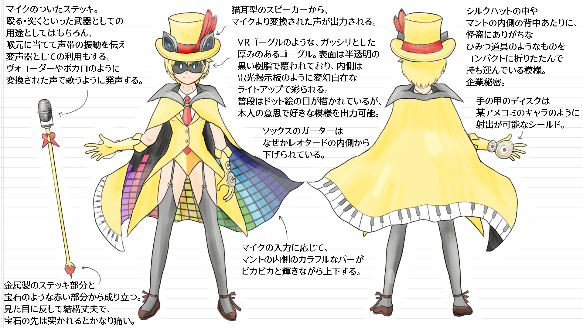 電光掲示板のように変幻自在な模様を映し出すゴーグルと、変声機を兼ねたマイクのつきのステッキがチャームポイント。喉元に当てられたマイクには声帯の振動が直接入力され、シルクハットについた猫耳スピーカーから発せられる。ヴォコーダーのように歪めて出力されるその声は、相手をからかうように歌うような独特の喋り方と相まって、まるでボーカロイドのよう。