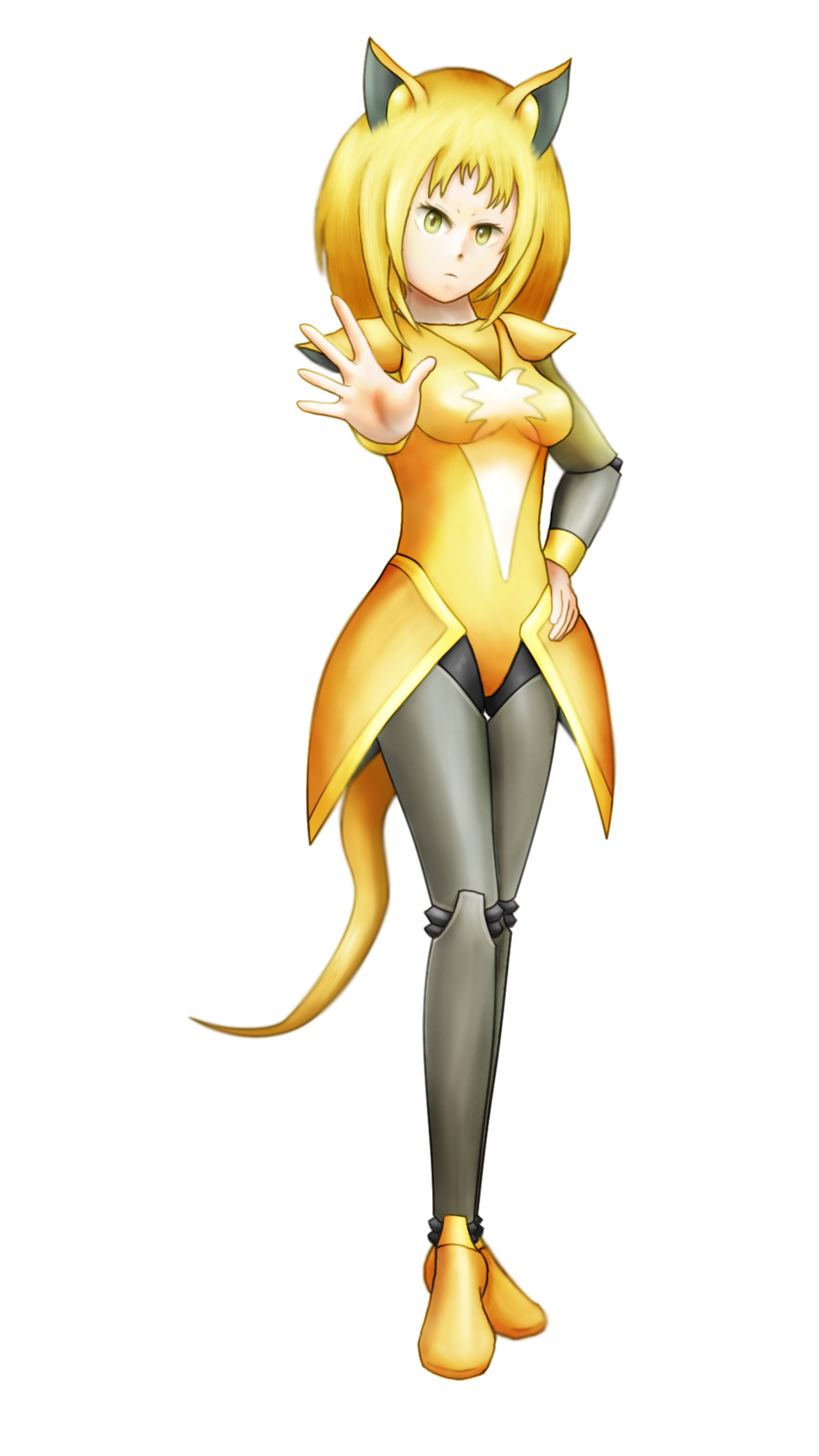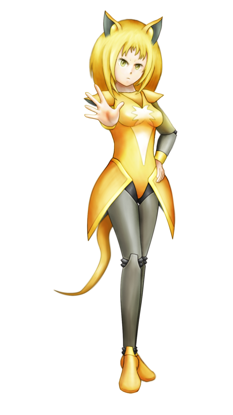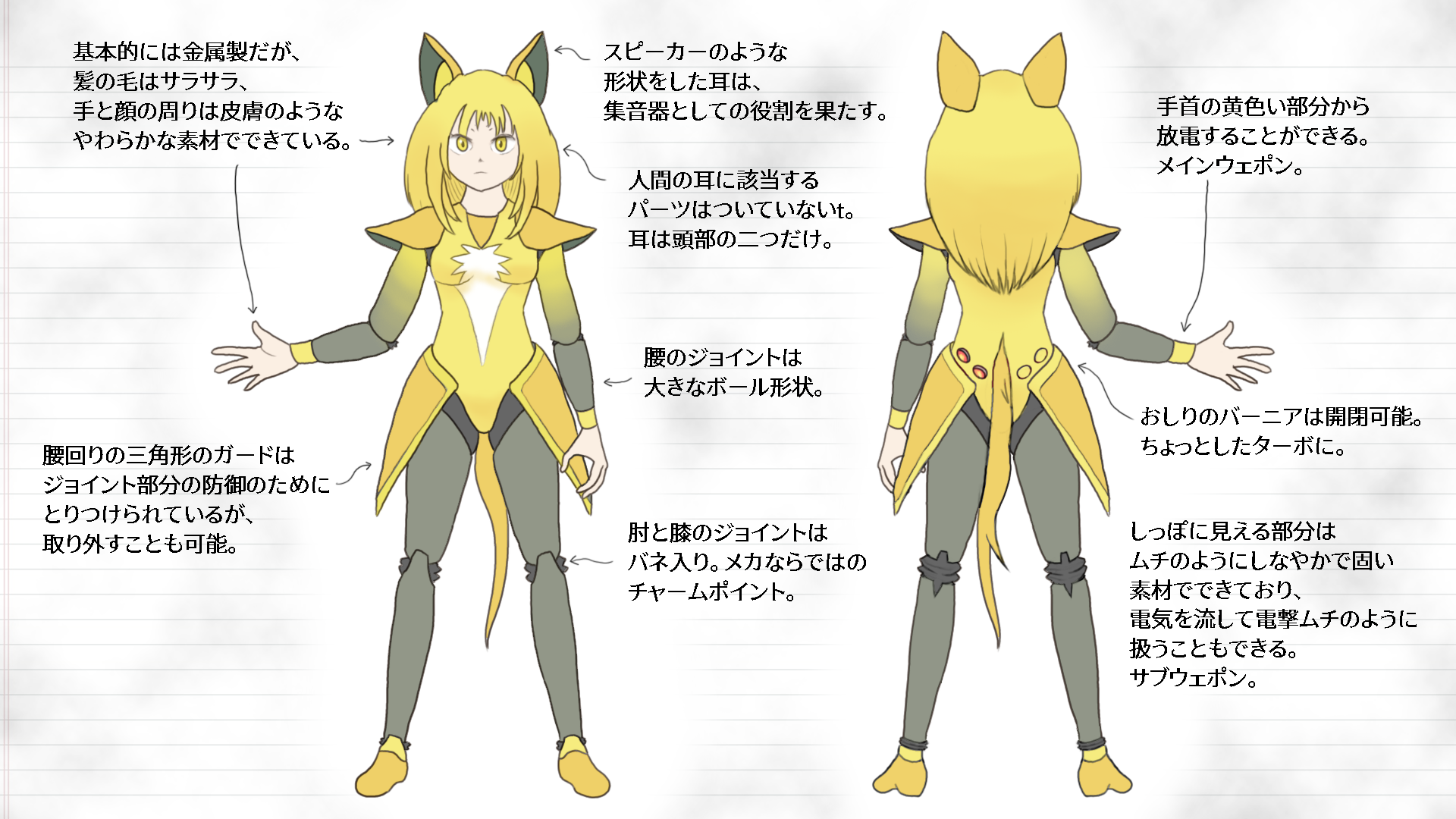 パルスワンの姿を見て「レオタードっぽいのを練りたい!」という 自分の熱意と癖が反映された故のデザインですが、 でんきタイプだったこととか、なんやかんやあって 何故かロボ子に仕上がりました。 デザインは結構気に入っているのですが、 ロボ特有の間接のせいでいささか描きにくいのが困りもの。